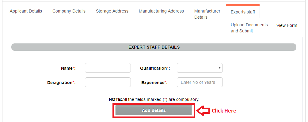Expert staff section takes the details of the staff working for the manufacturer. After entering all the details click on Add Details.